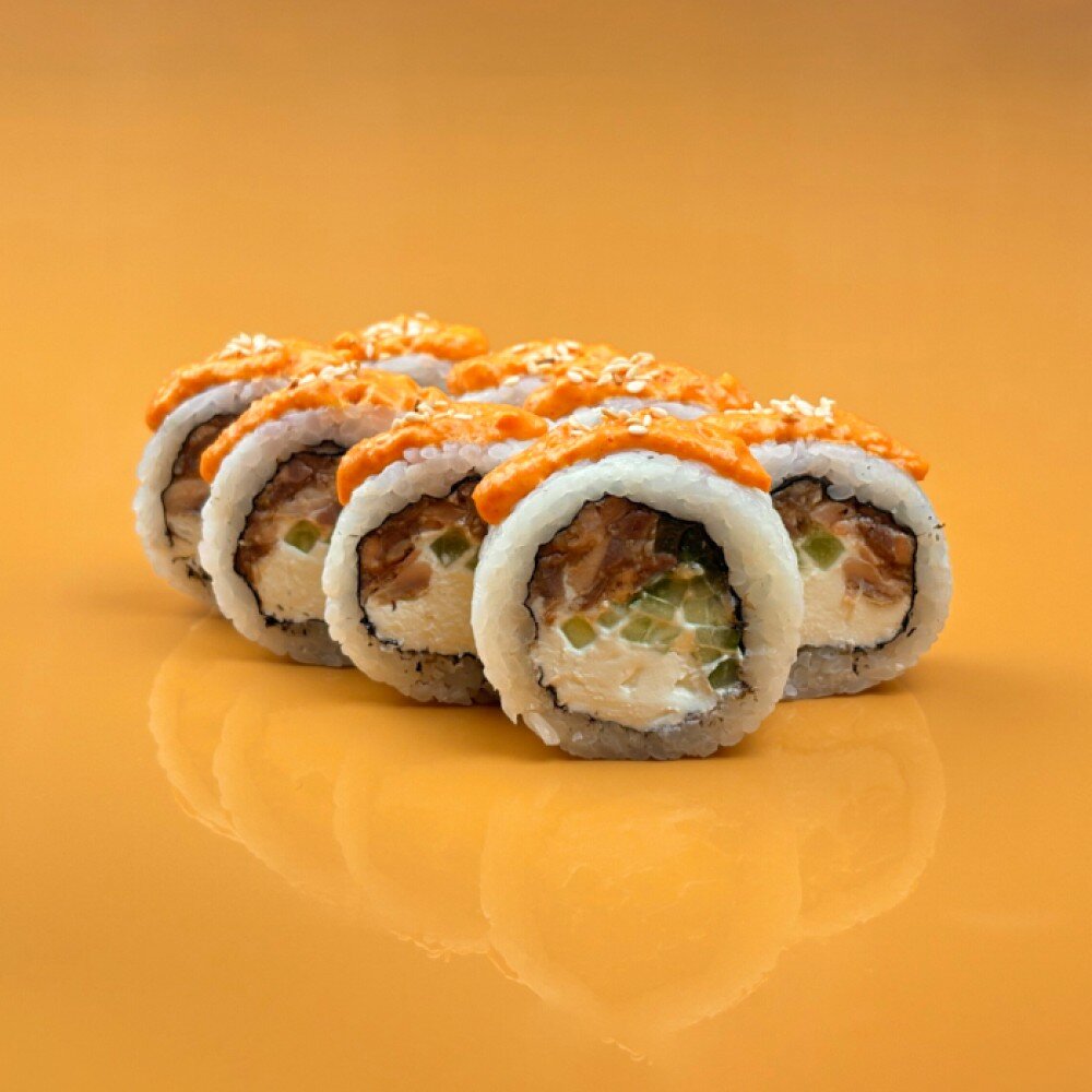 Ролл с жаренным лососем в соусе унаги, творожным сыром, огурцом и всё это под фирменным соусом том ям