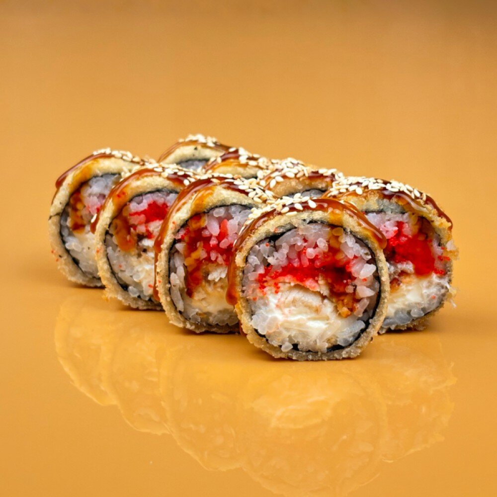 Жареный ролл в темпуре, с творожным сыром, с угрем и икрой летучей рыбы, украшен соусом унаги