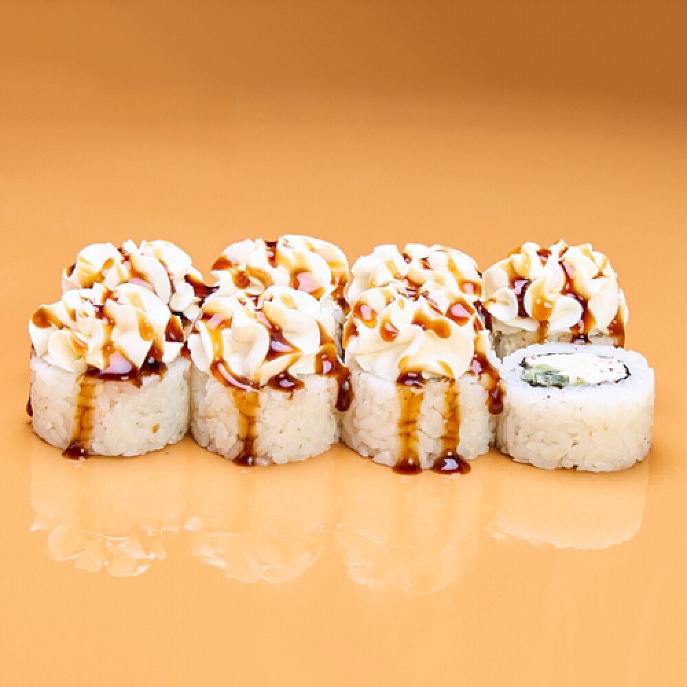 Ролл со свежим огурцом, снежным крабом, творожным сыром, украшен соусом унаги.