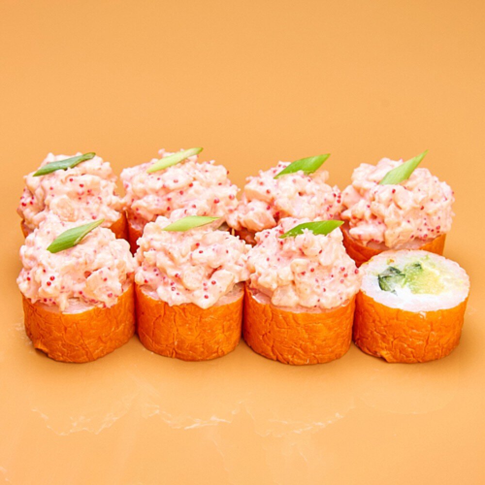 Ролл со свежим огурцом, авокадо, творожным сыром, сверху соус с кусочками креветки, украшен зеленым луком.