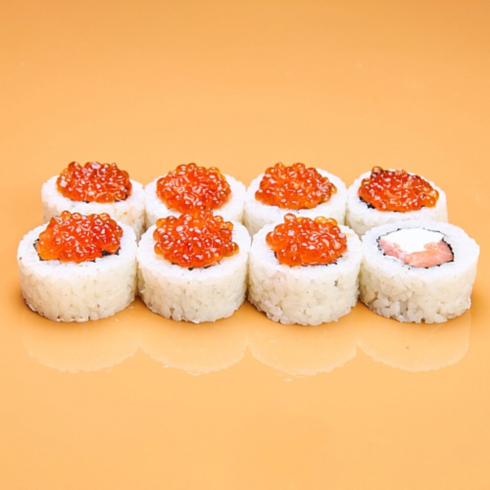 Ролл с лососем, творожным сыром, сверху украшен икрой лосося