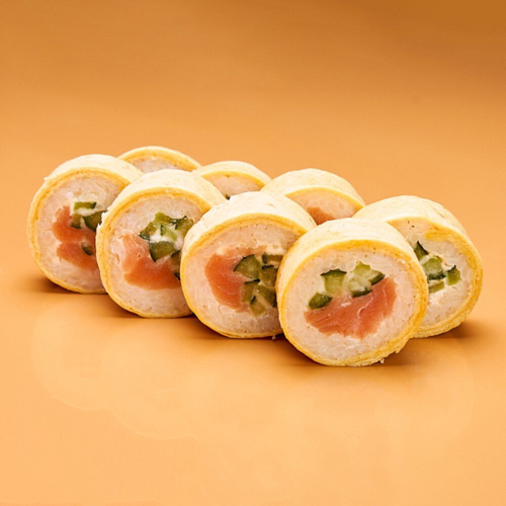 Ролл обернутый в тортилью, с лососем, чесночным соусом и свежим огурцом.