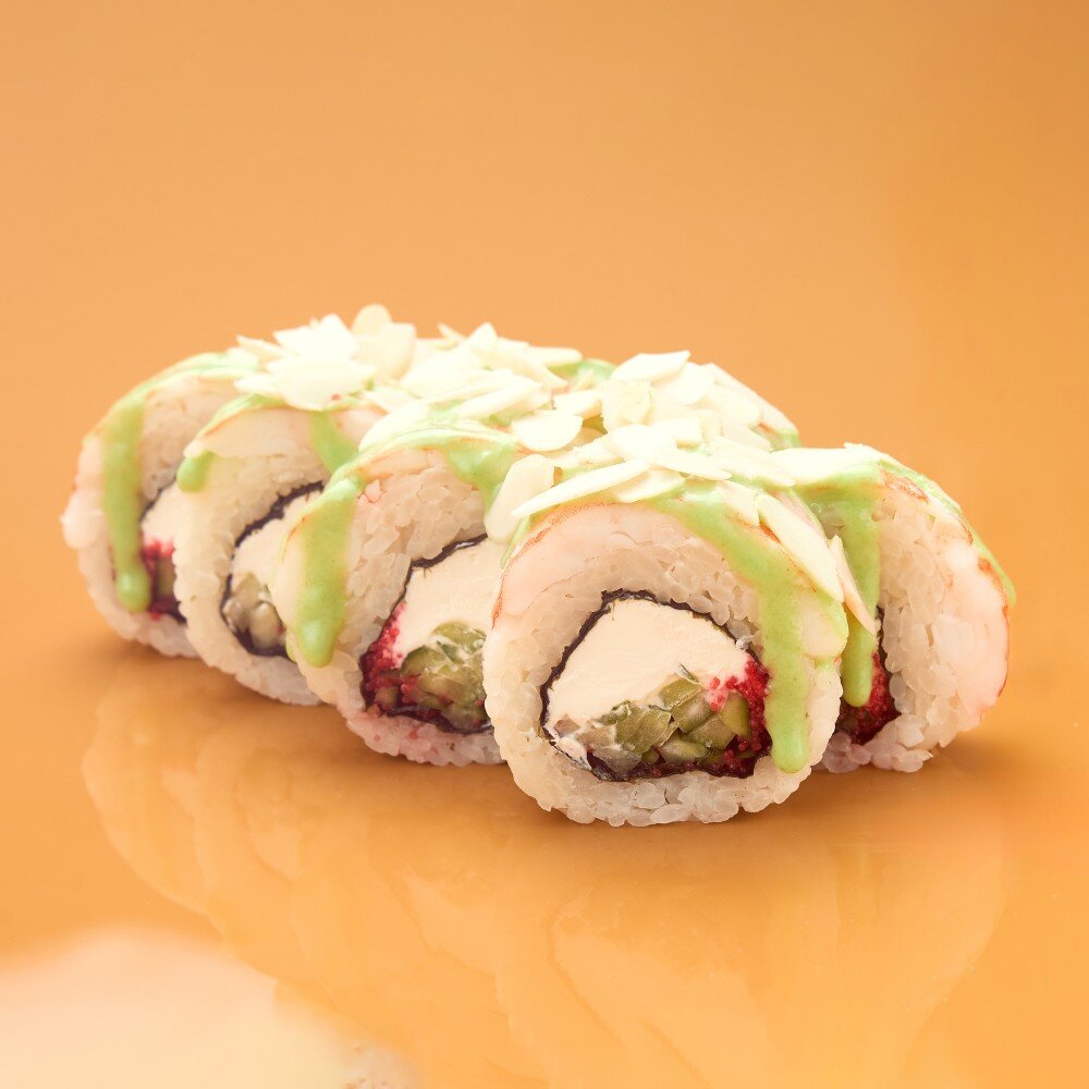 Ролл со свежим огурцом, икрой летучей рыбы и творожным сыром, сверху креветка, украшен соусом унаги.