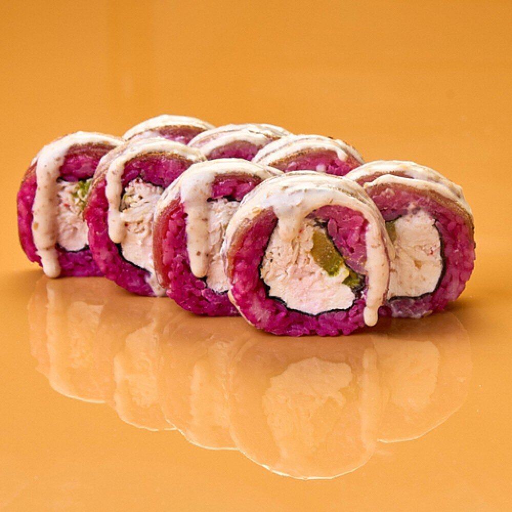 Ролл с творожным сыром, авокадо, снежным крабом, сверху тунец, украшен ореховым соусом.