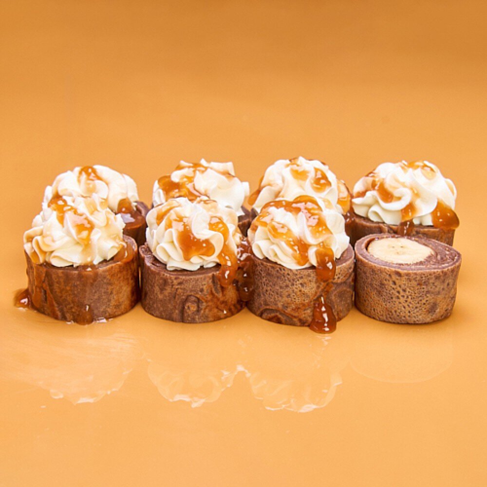 Сладкий ролл в шоколадном блинчике, с нутеллой и бананом, украшен творожным сыром и шоколадным топпингом.