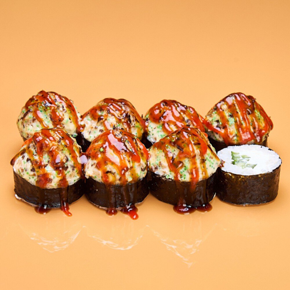 Ролл с творожным сыром и свежим огурцом, запекается с шапкой из грибов "шиитаке", украшен соусом унаги и соусом шрирача.