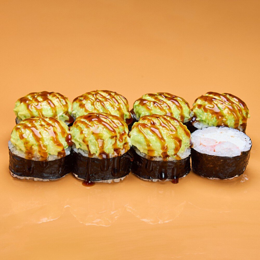 Ролл с творожным сыром и креветкой, запекается с соусом "Яки", украшен соусом унаги.