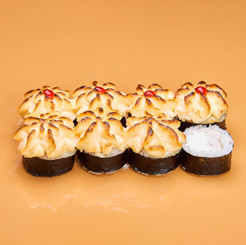 Ролл с творожным сыром курицей х/к, запекается с чесночным соусом, украшен соусом шрирача.