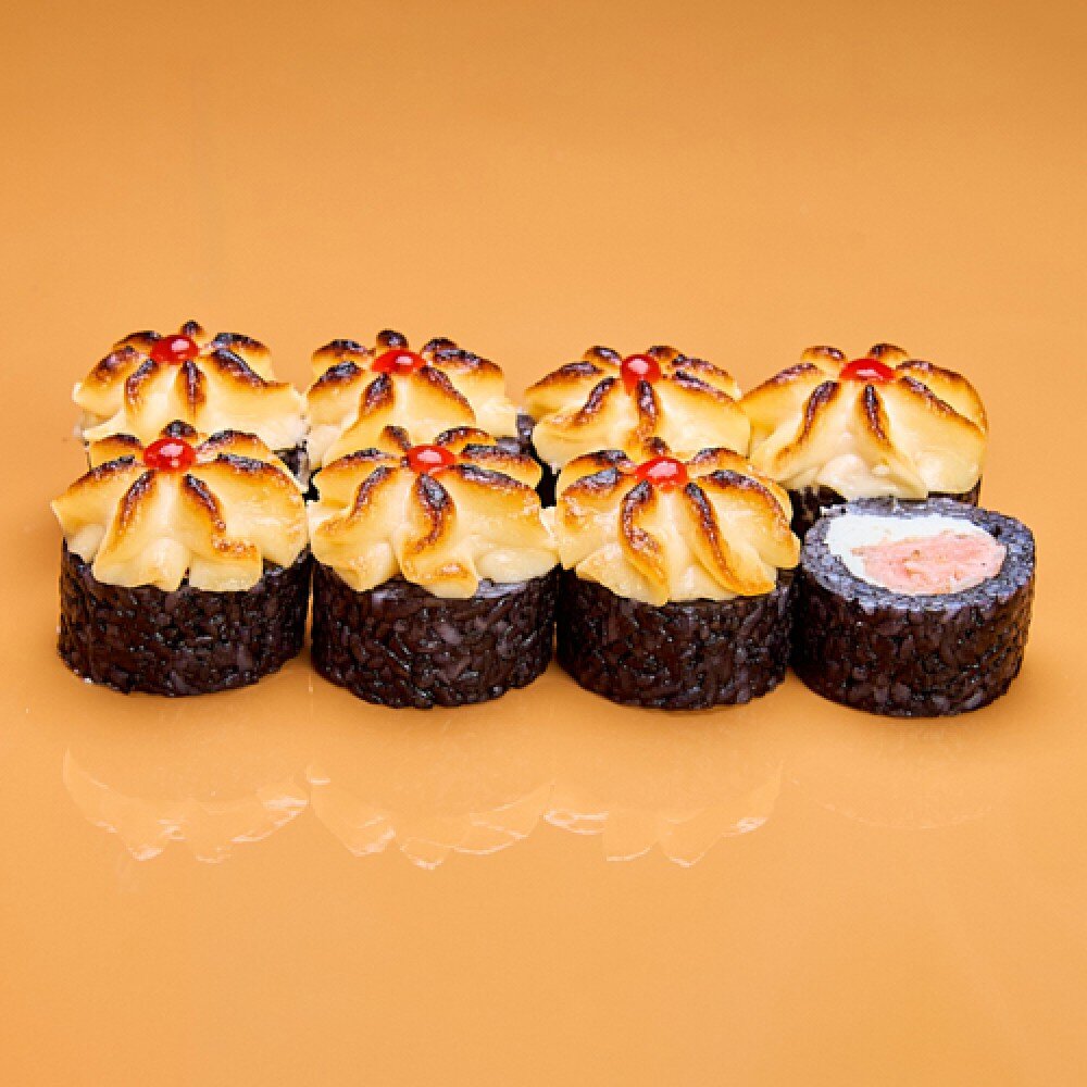 Ролл с творожным сыром и лососем в темпуре, запекается с чесночным соусом , украшен соусом шрирача.