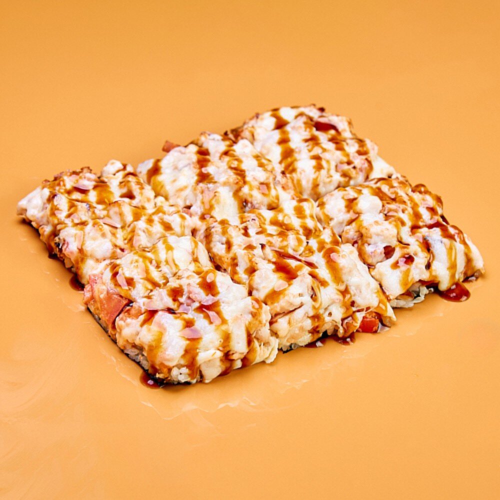 Лист нори, соус чесночный, курица х/к, бекон, помидор, моцарелла, соус унаги