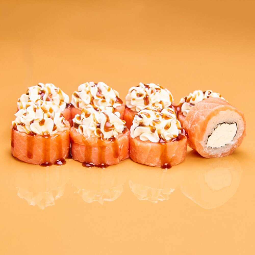 Ролл с творожным сыром, обернут лососем, украшен творожным сыром и соусом унаги