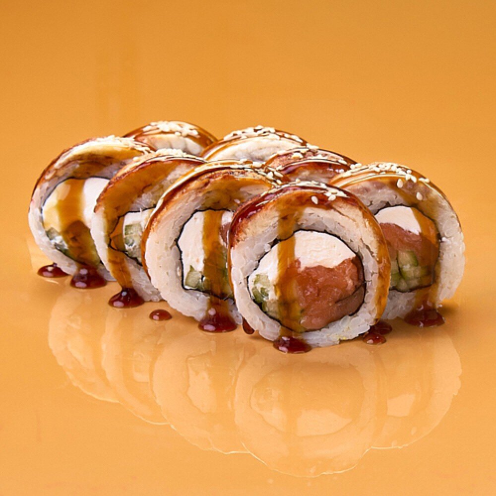Ролл с творожным сыром, лососем, свежим огурцом, обернут угрём, украшен соусом унаги и кунжутом.