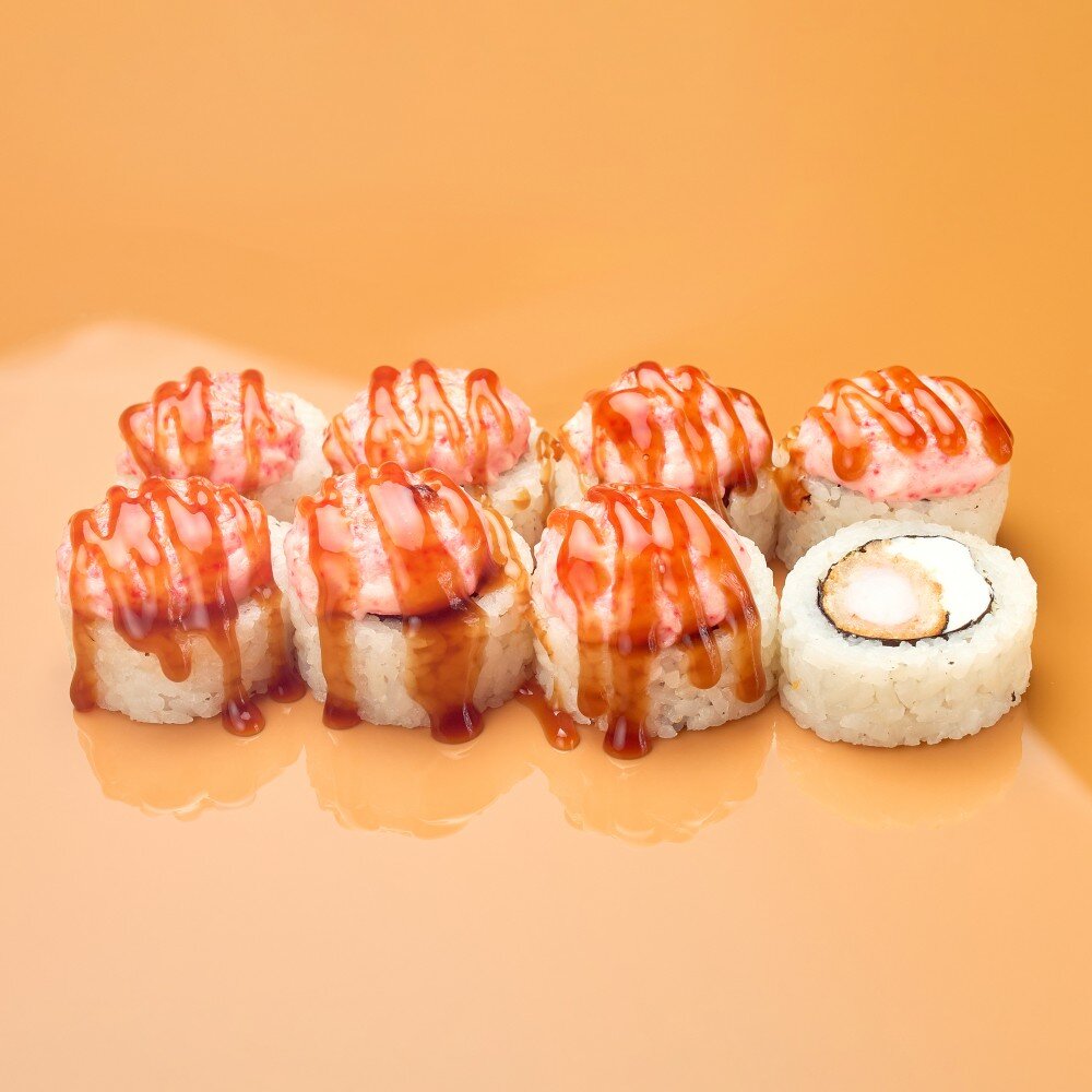 Ролл с креветкой в темпуре и творожным сыром, запекается с чесночным соусом и сыром, украшен соусом унаги.
