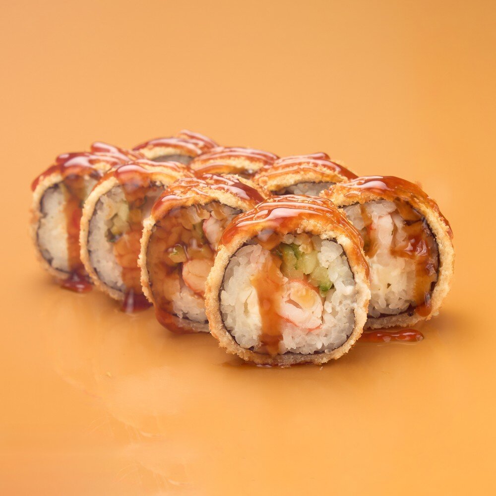 Жареный ролл в темпуре, с творожным сыром, креветкой и свежим огурцом, украшен соусом унаги.